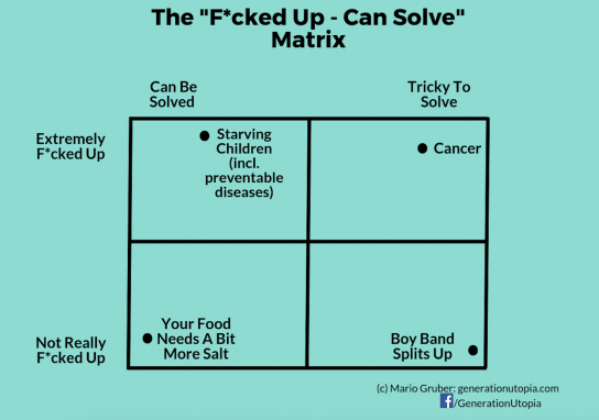 While this project, and my main focus, is actually about innovation and its role in solving the world’s remaining problems, I think that this process should start with identifying what the biggest problems are and to set priorities accordingly. In my mind, our number-one priority, and by ‘us’ I mean the people of the developed nations, should be to end extreme poverty, i.e. humans starving or dying of preventable diseases(b).