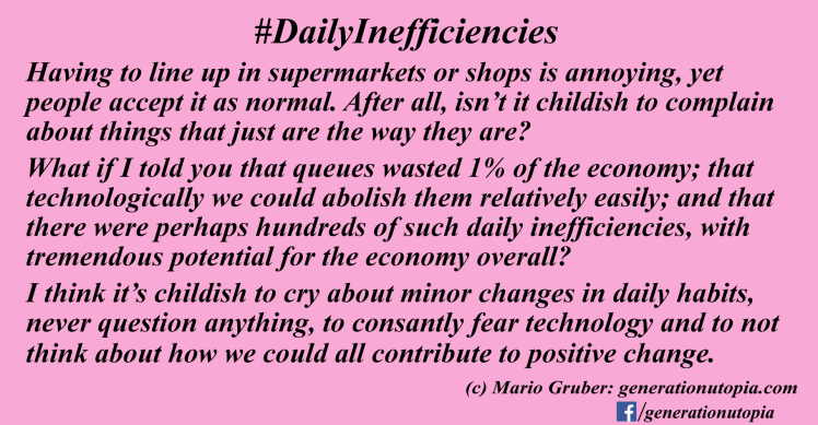 So the other day I went to a supermarket in Vienna just to buy a little snack for € 2. It took me about 45 seconds to decide on and grab the snack, but then I hit the queue and had to wait another 8 minutes. That sounds annoying, right? Well, I think it’s a much bigger deal than just annoying. A quick calculation (see below) suggests that the opportunity cost of queues is over 1% of our GDP. Moreover, I argue that this is just one little example of a daily inefficiency along with hundreds of others that because we accept and don’t push for innovation enough, is why we can’t have (more) nice things.