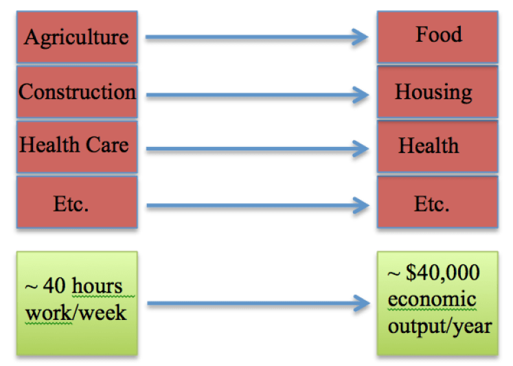 And that applies to the economy as a whole, every product and service. You see, at some point in the past, before the industrial revolution, our economic output was only around $1,000 per person per year even though we probably worked sixty hours a week. So how on Earth did we grow our economy so much without increasing inputs by a factor of forty? Good question. Best question ever! Truly understanding the answer to this question, at a deep level, is the key to changing the world and to creating a Utopia.