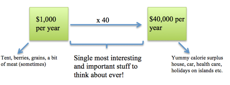By the way, if you feel like we’re not getting forty times more nowadays, try to live with $1,000 a year, i.e. primitive shelter, fruits and grains and only one chicken breast a week, and you’ll realize how much better we have it today.