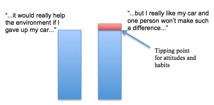 For example, let’s compare car owners and users of public transport. For car owners it’s usually unimaginable to just switch to public transport. They’re used to the monthly expense so the cost saving of switching to public transport is not such a great motivation. For people who are used to public transport to suddenly pay several times more to get from A to B is extremely painful, thus it will not support any type of incentive for change. Moreover, car owners are emotionally attached to their cars, love the flexibility and don’t want to wait for an underground, etc. A car owner’s cognition and habits are strongly internalized so a “strong” or radical change in habits and lifestyle does not come easily.