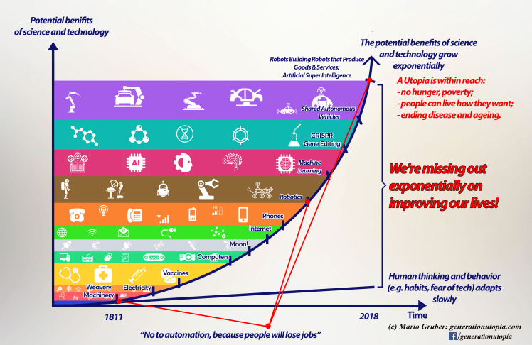 To reiterate the general GU-logic, the technological potential to improve our lives is exponentially greater than ever before, but to unleash that potential we humans need to really change our behavior, habits and take some crucial actions together. For example, we certainly have the technology and resources to end world hunger and save millions of starving children a year, but the societal and political will to take action is not quite sufficient. The same is true for fewer work hours (and more free time) or solutions to climate change. Technically we could make all that happen, but the bottleneck is usually that we humans simply won’t give up our beliefs and habits.